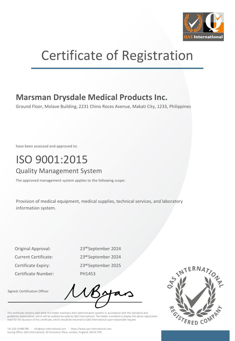 At Marsman Drysdale Medical Products, Inc. (MDMPI), we are committed to upholding the highest standards of quality, safety, and reliability in the healthcare industry. Our dedication to excellence is reflected in our compliance with internationally recognized quality management systems and regulatory standards.